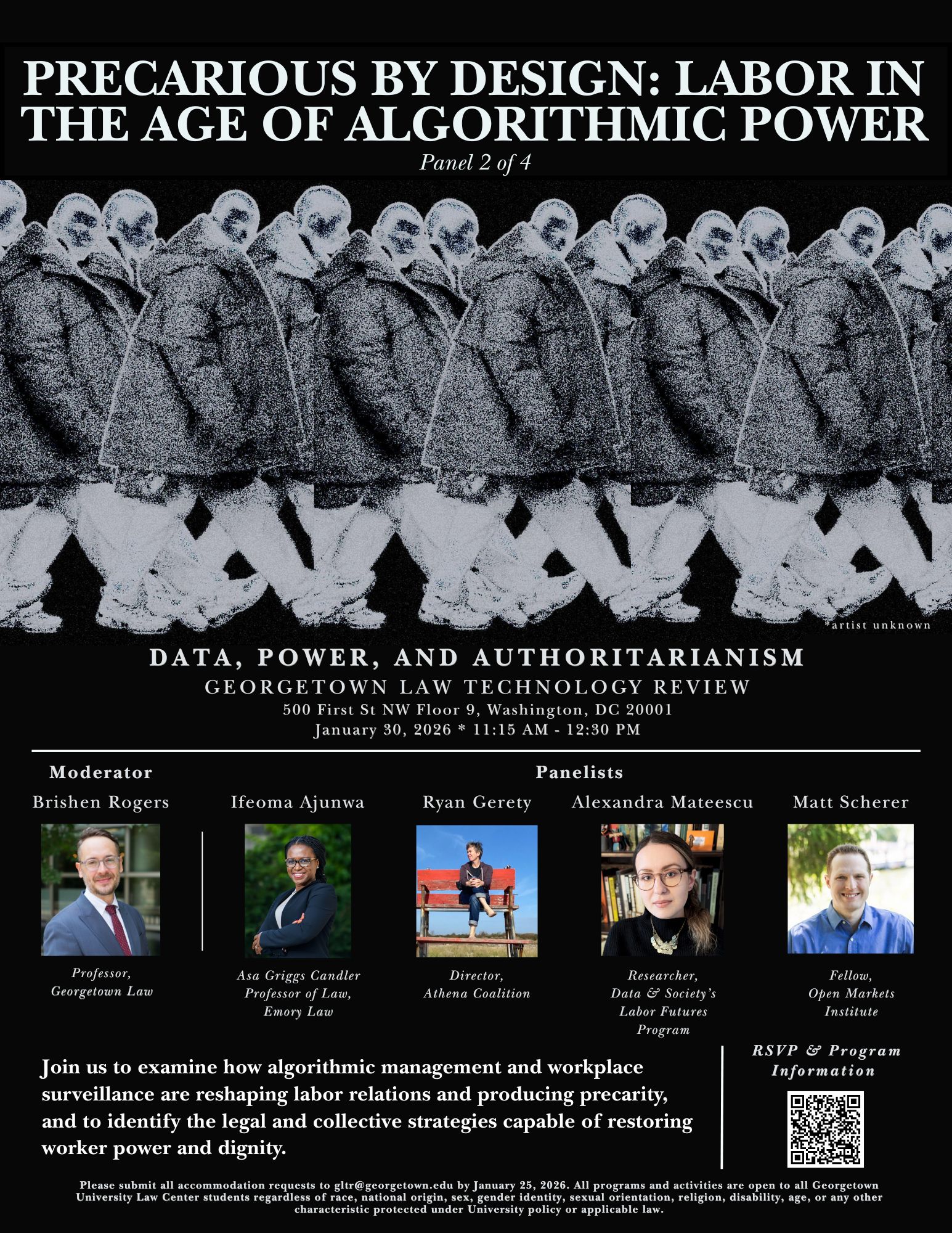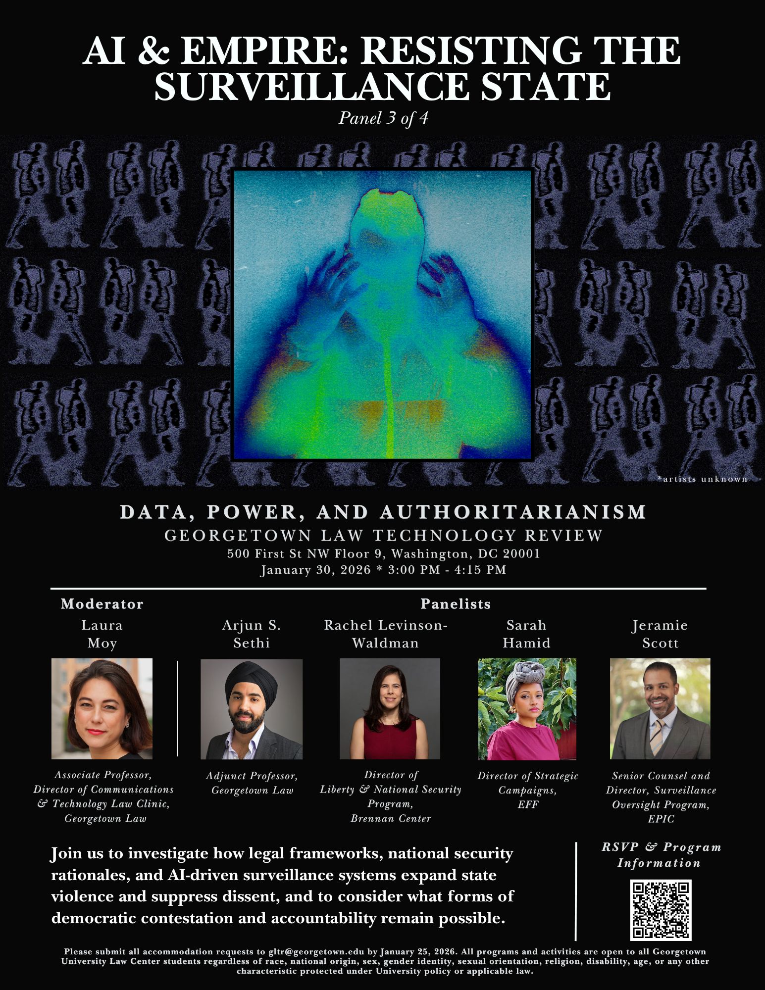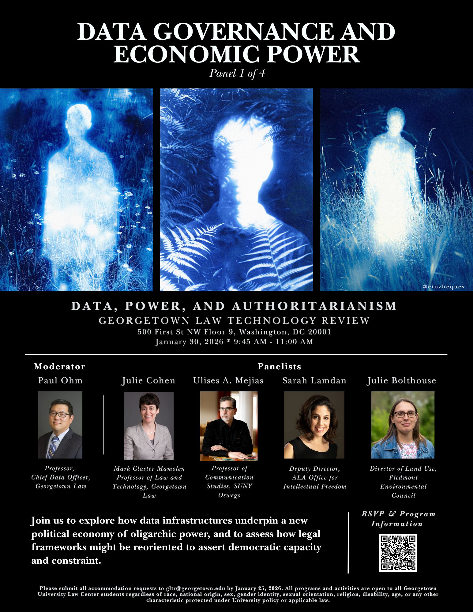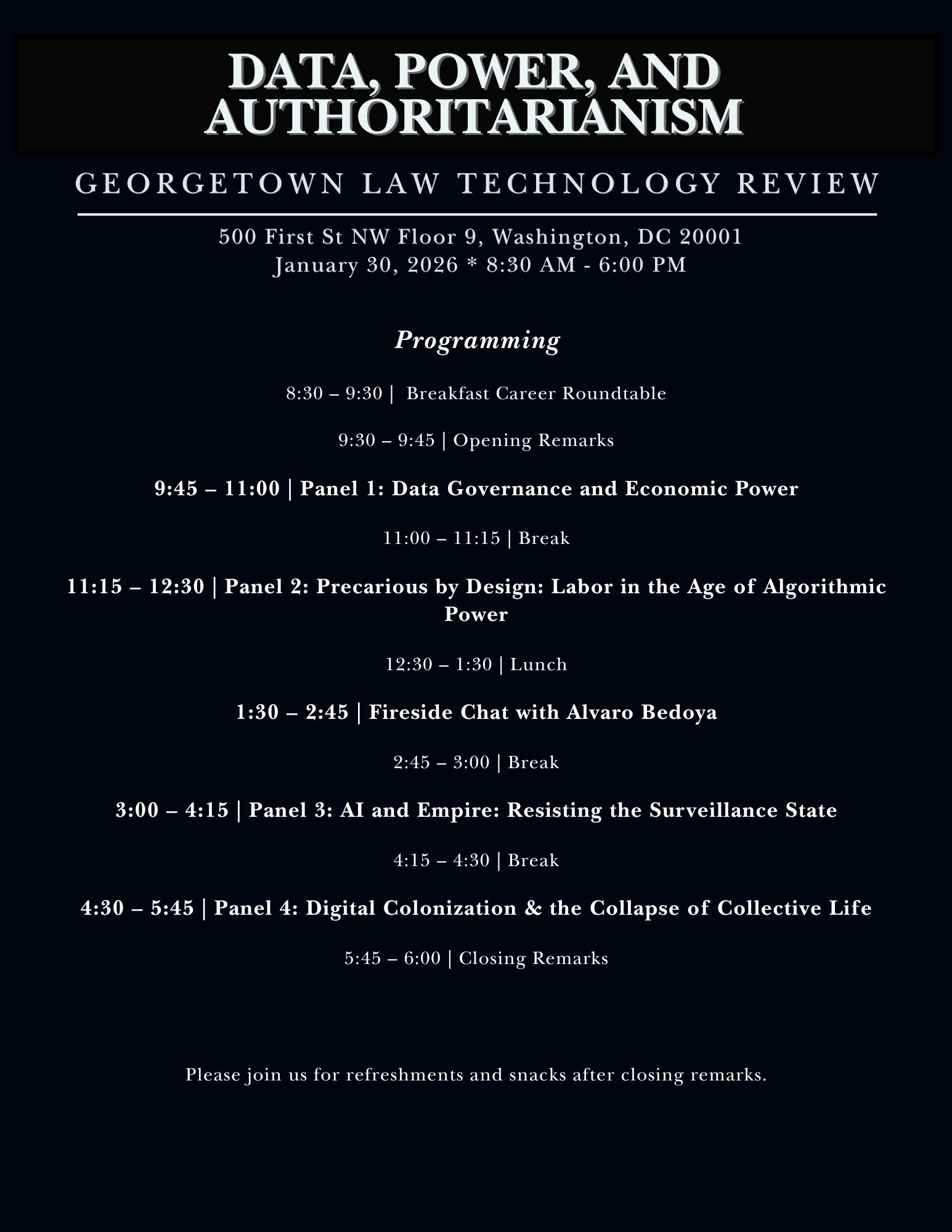 The Georgetown Law Technology Review (GLTR) will host its biennial Symposium on Friday, January 30, 2026, at 500 First Street NW Floor 9 on the Georgetown Law campus. The day-long event will bring together scholars, practitioners, and advocates for a series of panels and a keynote discussion centered on this year’s theme, Data, Power, and Authoritarianism.