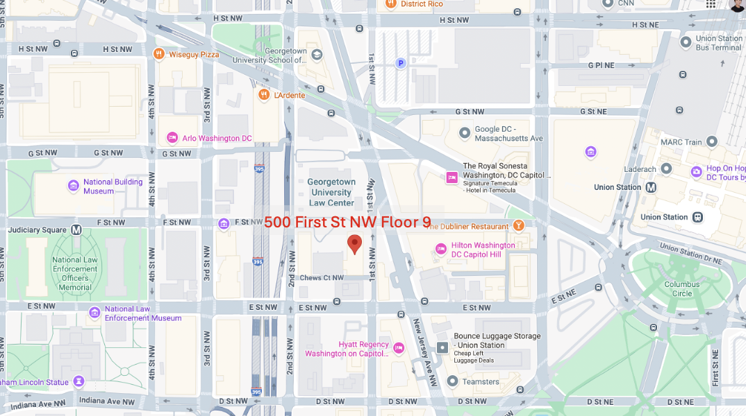 500 First St NW is located on the corner of First St NW and F St NW, with the entrance on the First St NW side. The Symposium is held on Floor 9.